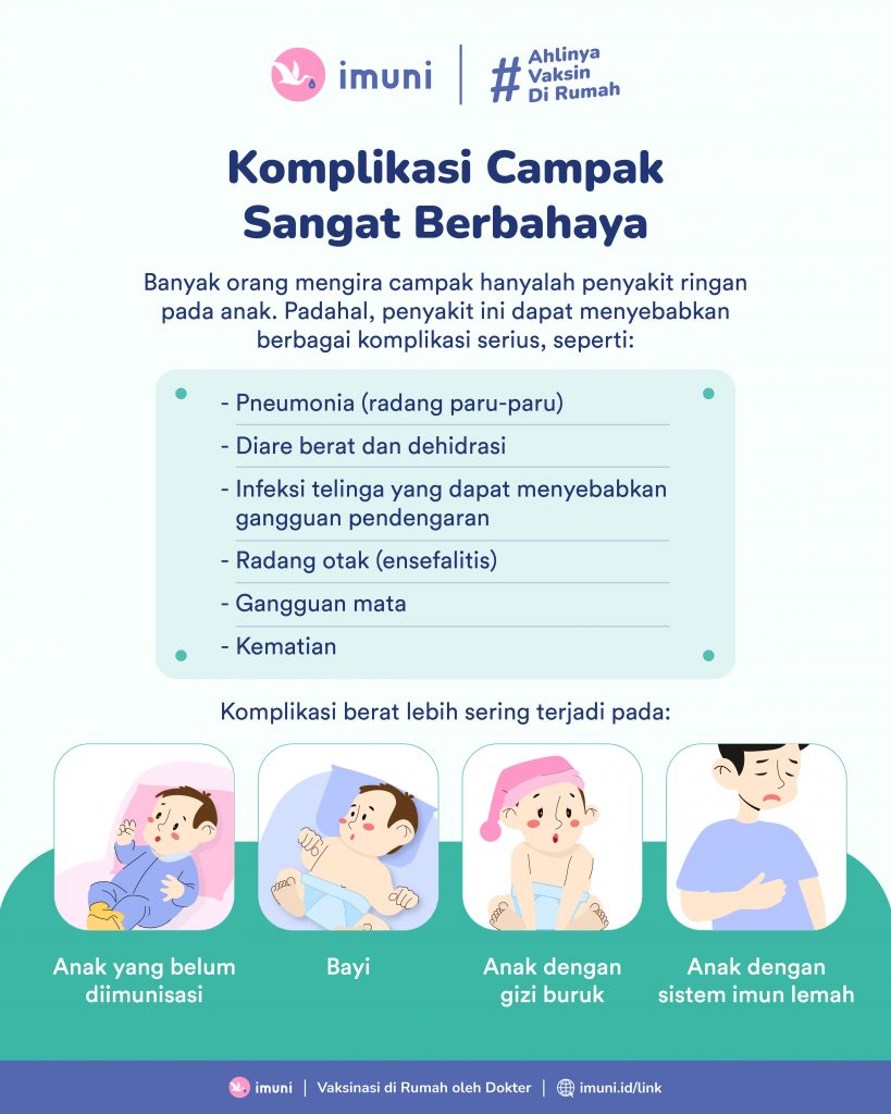 Banyak orang mengira campak hanyalah penyakit ringan pada anak. Padahal, penyakit ini dapat menyebabkan berbagai komplikasi serius, seperti: