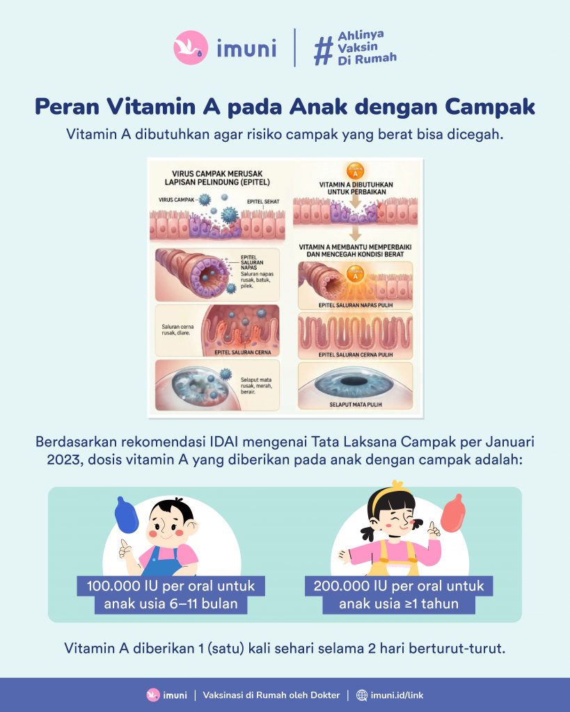 Sesuai rekomendasi IDAI, anak yang mengalami campak dianjurkan mendapatkan vitamin A dosis tinggi selama dua hari berturut-turut. Pemberian vitamin A terbukti dapat membantu menurunkan risiko komplikasi berat dan kematian akibat campak.