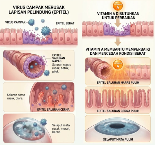 Vitamin A berperan penting dalam menjaga kesehatan lapisan epitel tubuh, termasuk pada saluran napas, saluran cerna, dan mata. Infeksi virus campak dapat merusak lapisan pelindung ini, sehingga meningkatkan risiko terjadinya infeksi lanjutan dan komplikasi. Dengan pemberian vitamin A, proses perbaikan jaringan dapat terbantu dan risiko komplikasi dapat berkurang.